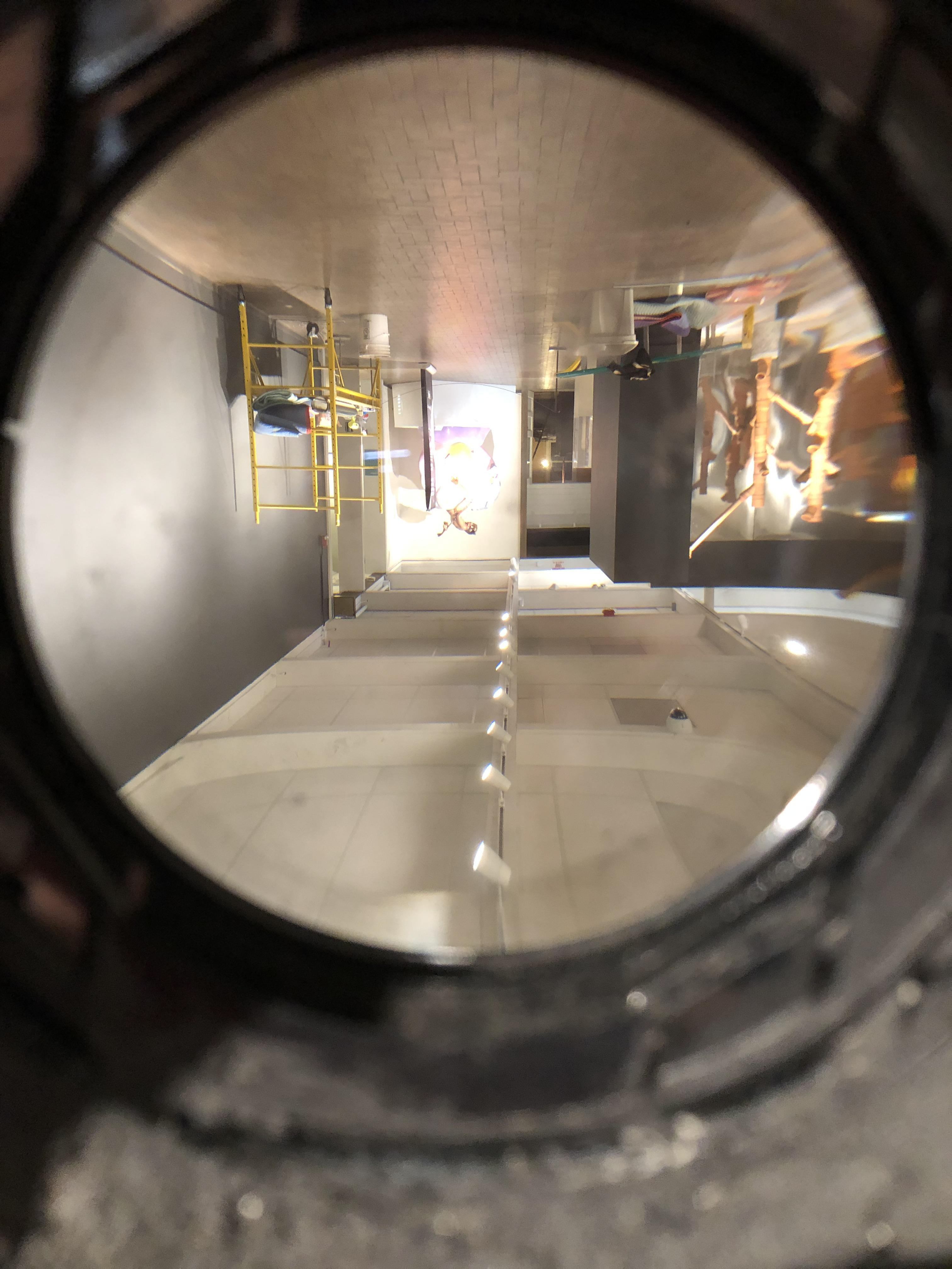 In Hindsight: Clouds meet the ocean, as the horizon between the two blurs. The installation has a film of silent moving clouds projected over an abandoned pier.